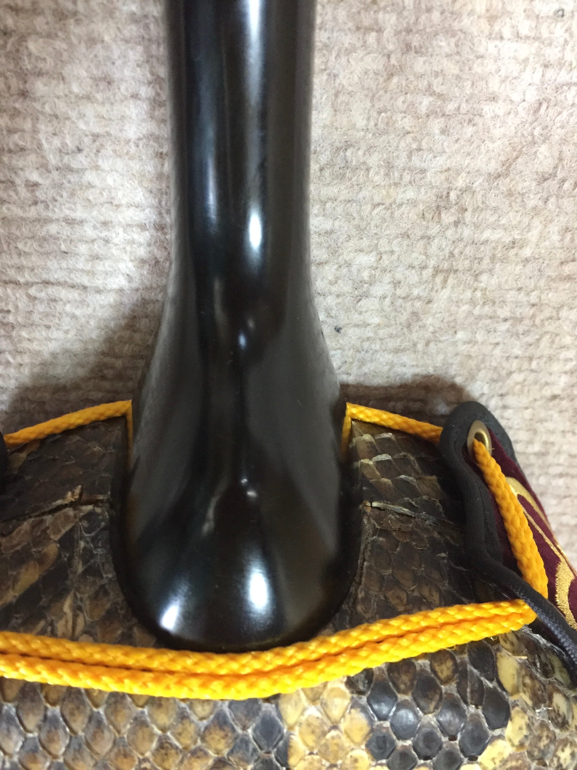 おそらく天然もののニシキヘビの皮で張って仕上げてある上物でございます。
